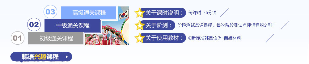 專業的韓語老師根據語言學習進階規律設置初級通關課程、中級通關課程、高級通關課程三階段,科學定制個性化課程,由淺入深的學習模式使學生逐步提升打下牢固的基礎。